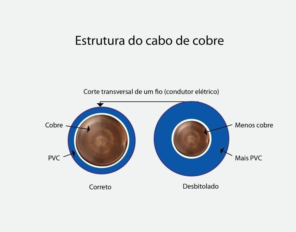⚠️ Cabos Desbitolados são cabos que, embora sejam vendidos com uma determinada bitola, na prática possuem menos material condutor do que deveriam. Ou seja, um cabo rotulado como 4 mm² pode ter, na realidade, apenas 3 mm² ou menos de condutor de cobre ou alumínio.