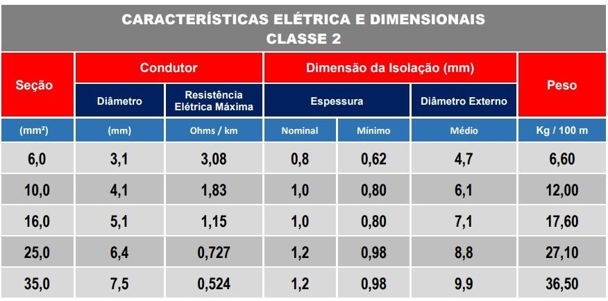 TABELA DE CARACTERÍSTICAS DIMENSIONAIS E ELÉTRICAS DO CABO