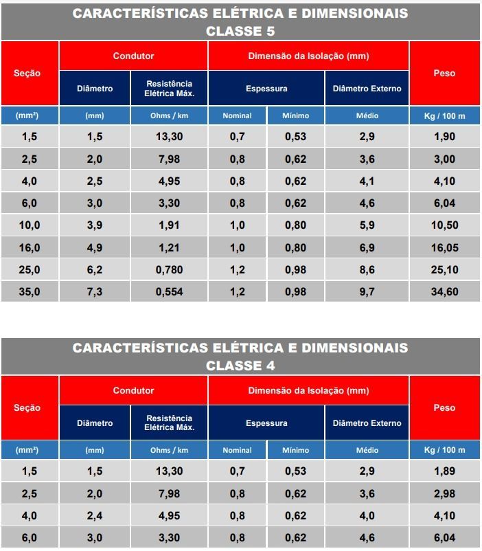 Nas seções: Encordoamento classe 4 1 x 1,5 mm² até 1 x 6,0 mm²
