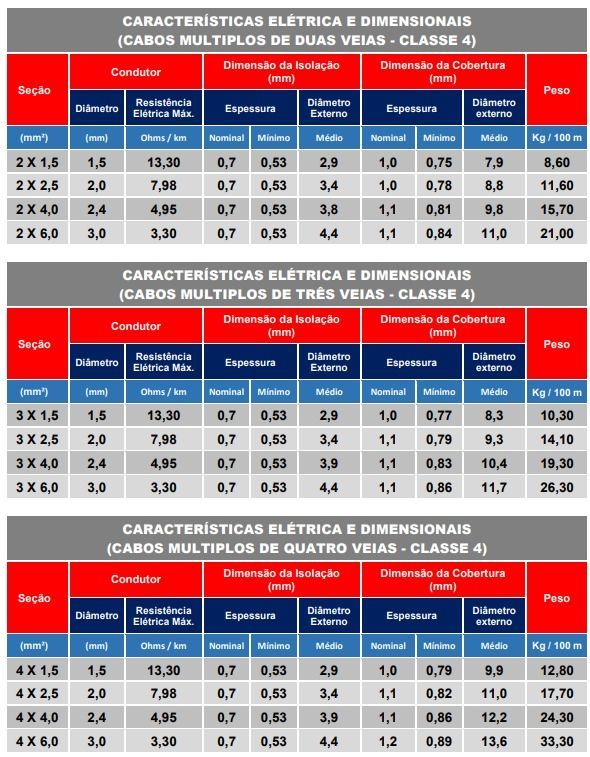 TABELA DE CARACTERÍSTICAS DIMENSIONAIS E ELÉTRICAS DO CABO
