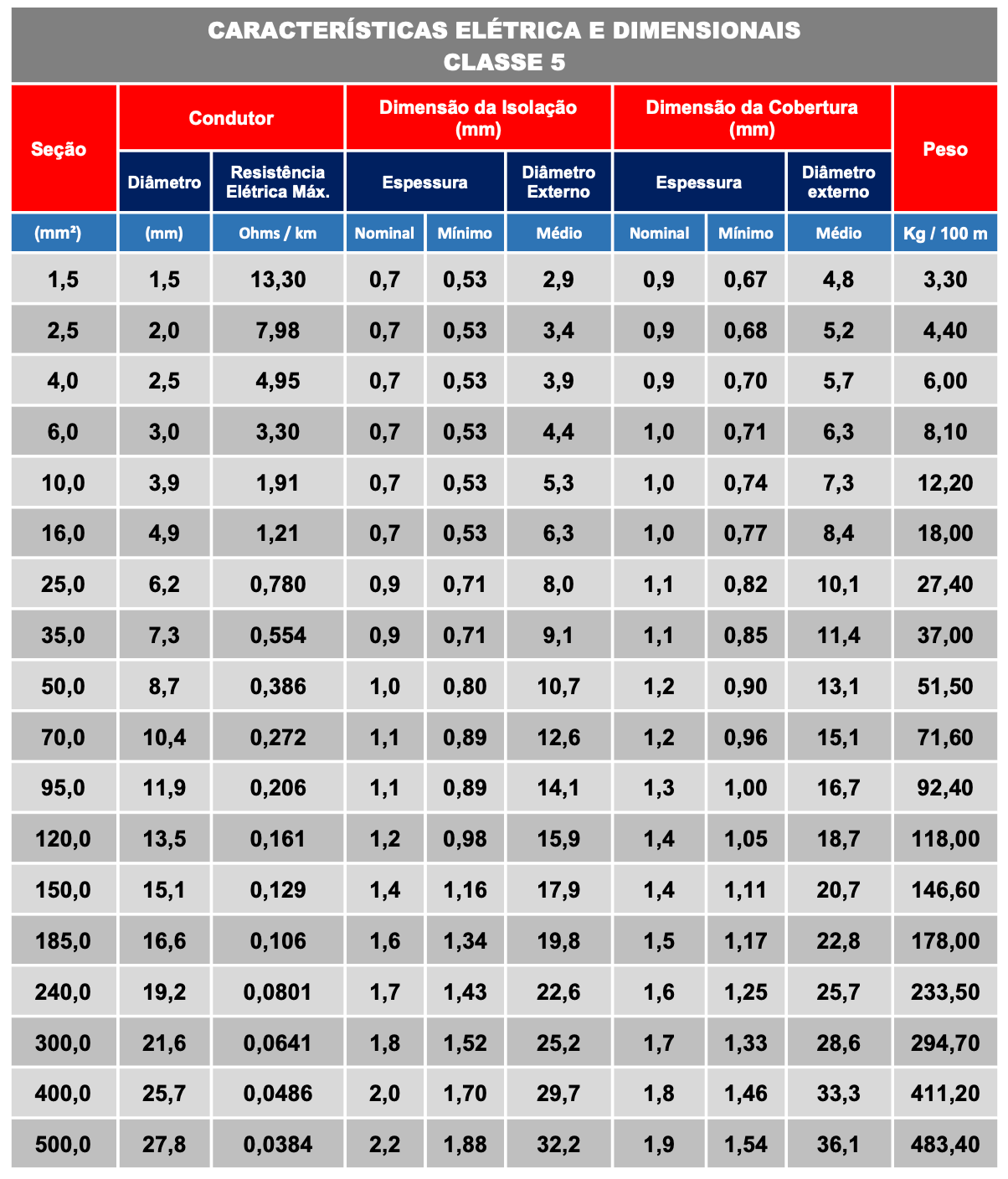 Encordoamento classe 5: 1 x 1,5 mm² até 1 x 500,0 mm²