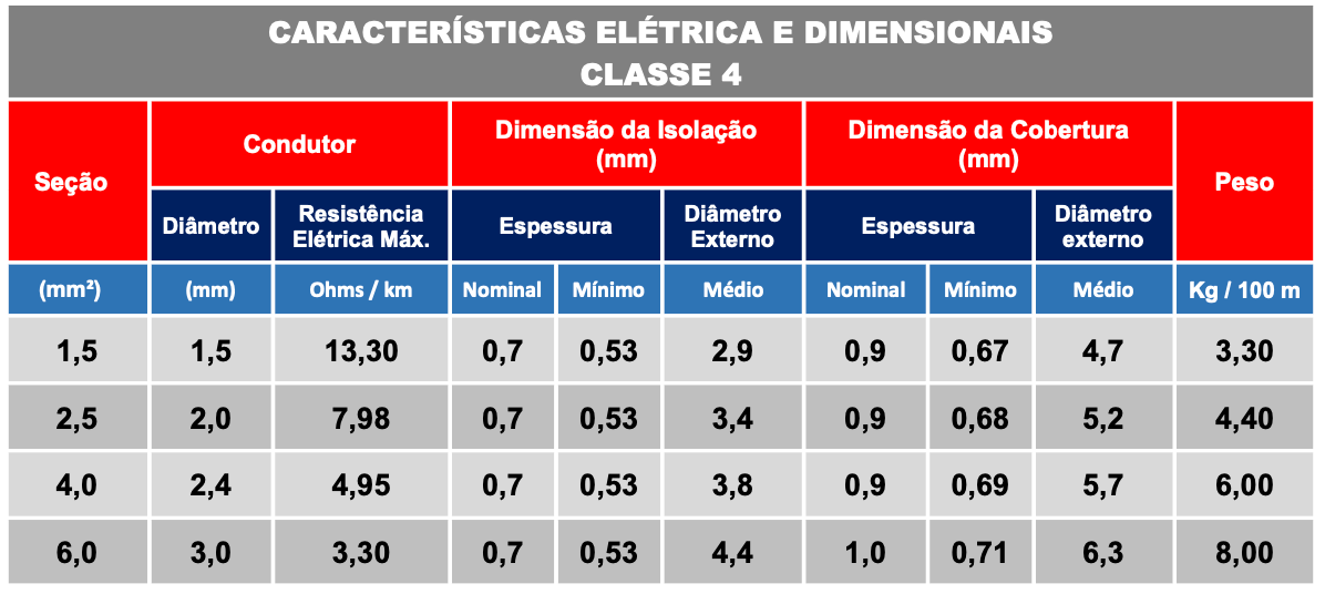 O condutor deve ser de cobre, com ou sem revestimento metálico, de têmpera mole, nas classes 4 e 5, conforme especificação norma NBR NM 280.